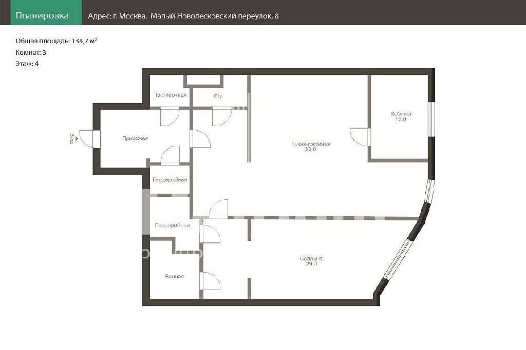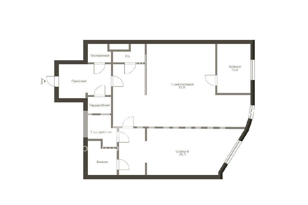 Планировка: кухня-гостиная, мастер-спальня, вторая спальня/кабинет, две гардеробные, две ванные и хозяйственная комната.